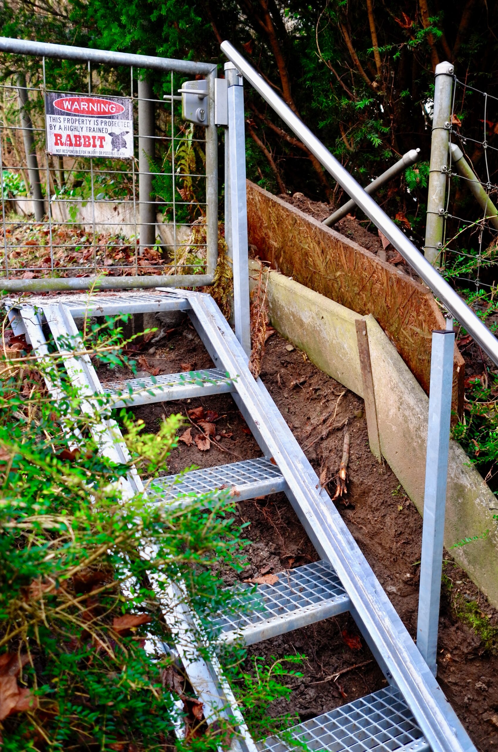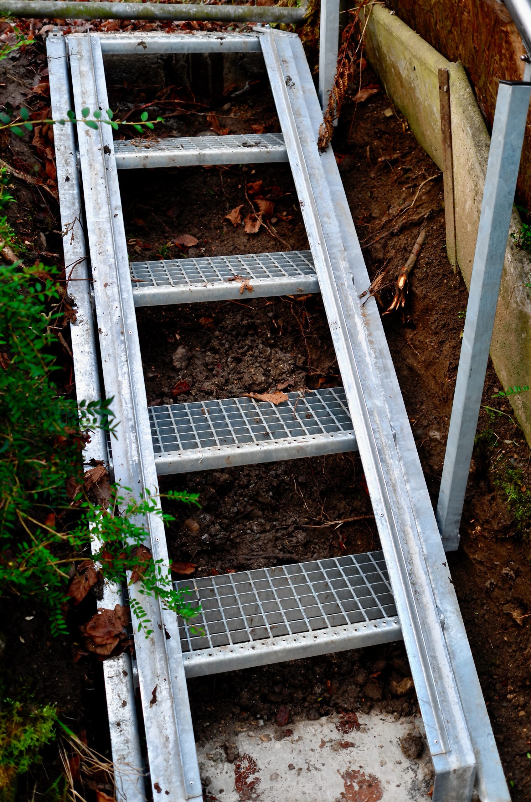 Der Kunde beauftragte uns mit dem Bau einer sicheren Stahltreppe im Garten. Ausserdem wünschte sich der Kunde seitliche Führungsschienen an der Treppe um die grüne Komposttonne hier sicher und leicht bewegen zu können.
