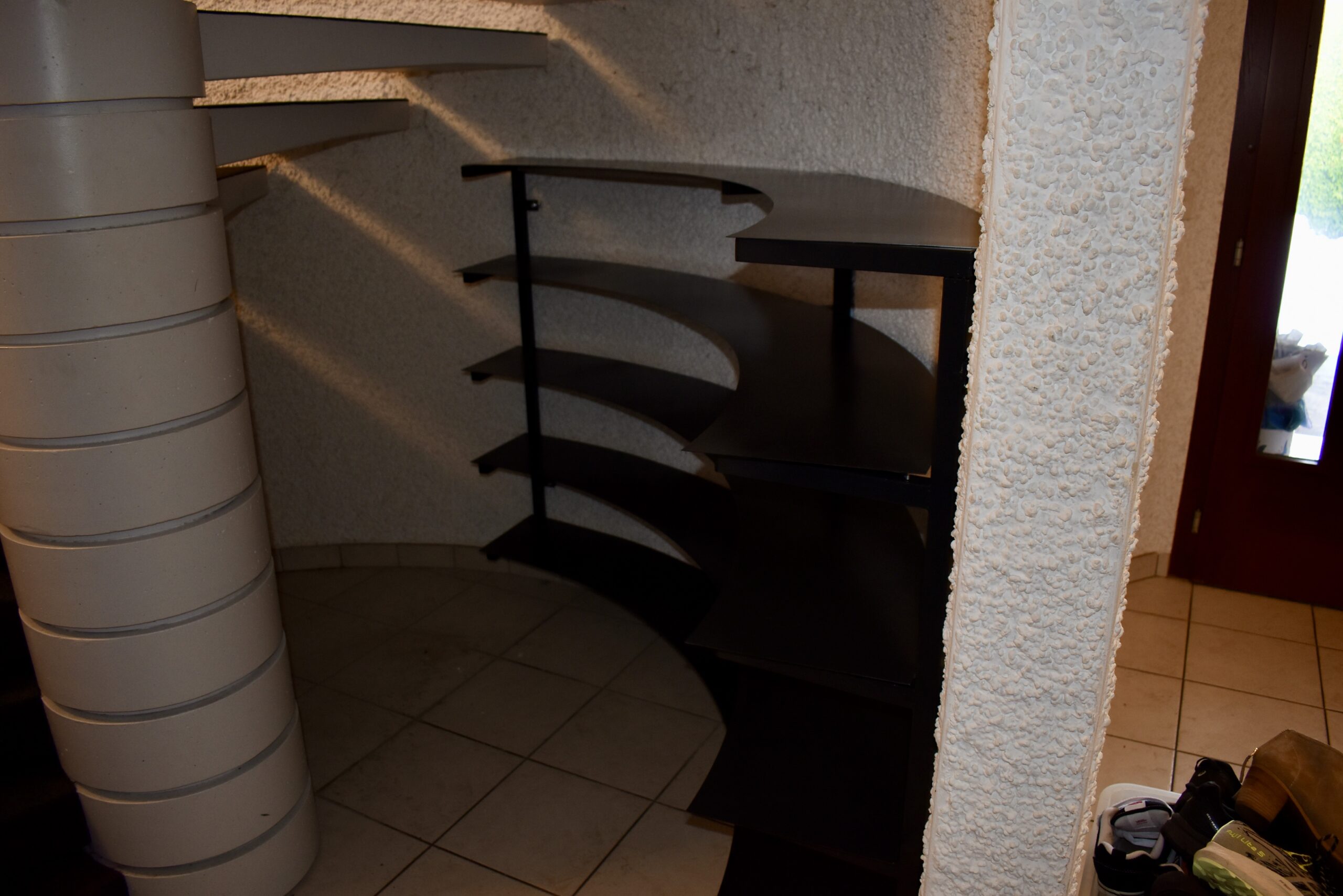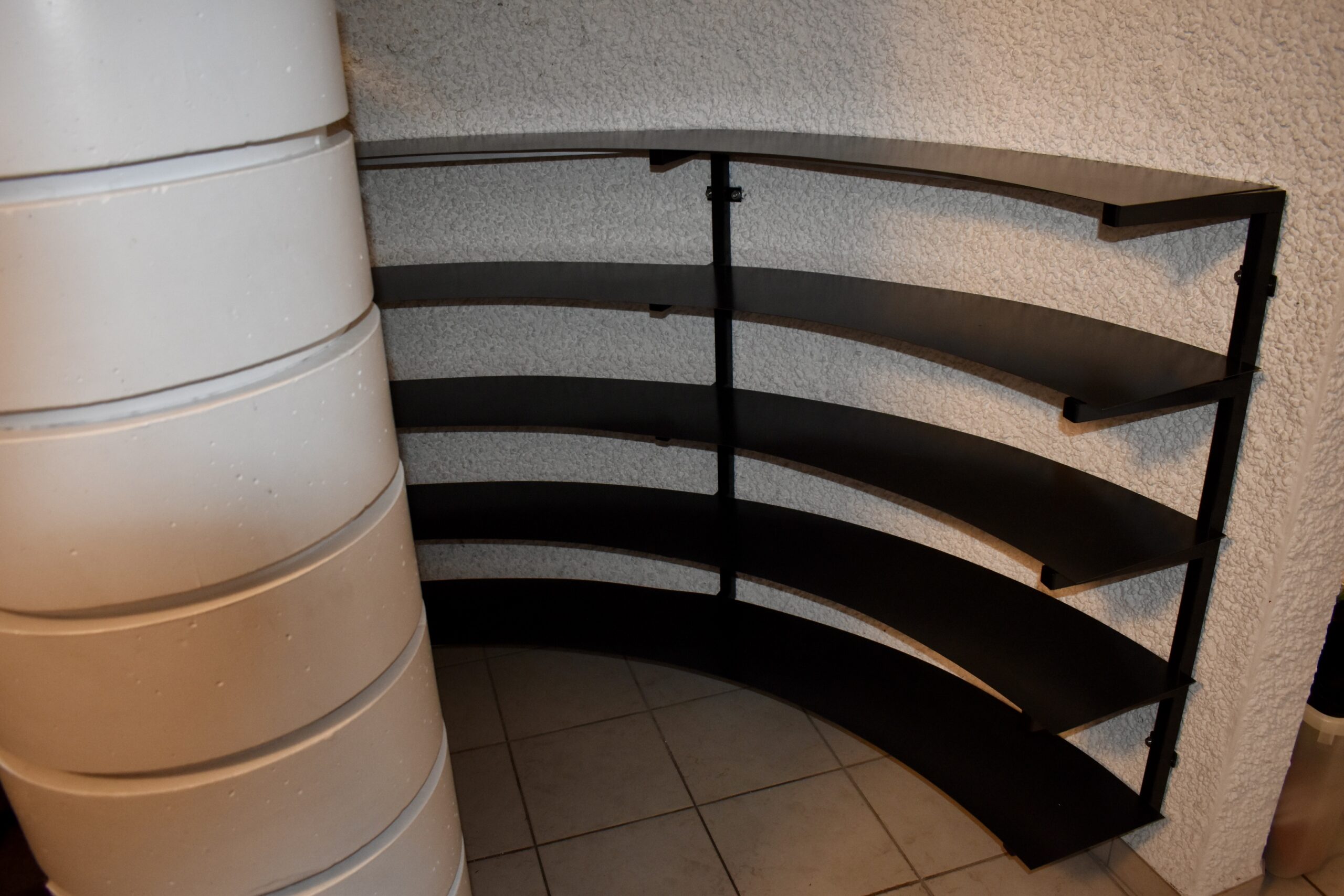 Der Kunde bat uns um den Bau eines filigranen Schuhregals aus Stahl welches sich an die runde Mauerwerkskontur anschmiegt. Die Anzahl der Tablare, die Tablarabstände sowie die Tablartiefe wurden nach Kundenwunsch gefertigt. Ein weiterer Wunsch des Kunden war ein Freiraum unterhalb des Regals für Reinigungszwecke weshalb wir das Regal vom Boden distanziert angebracht haben.