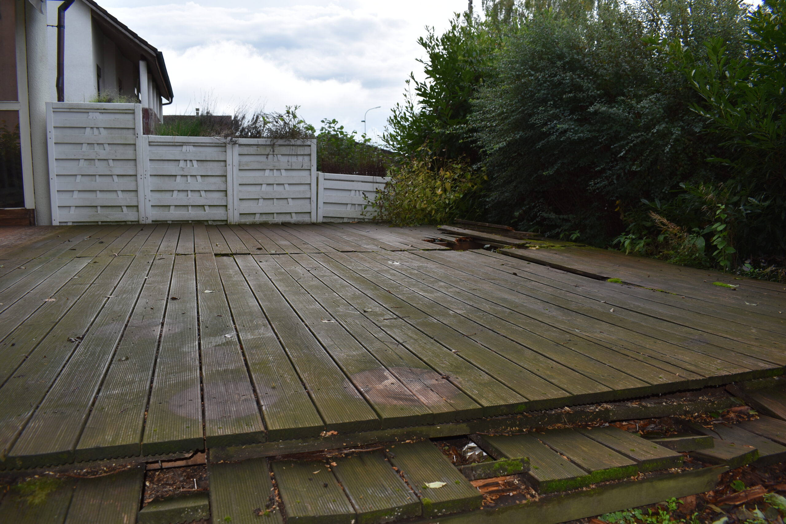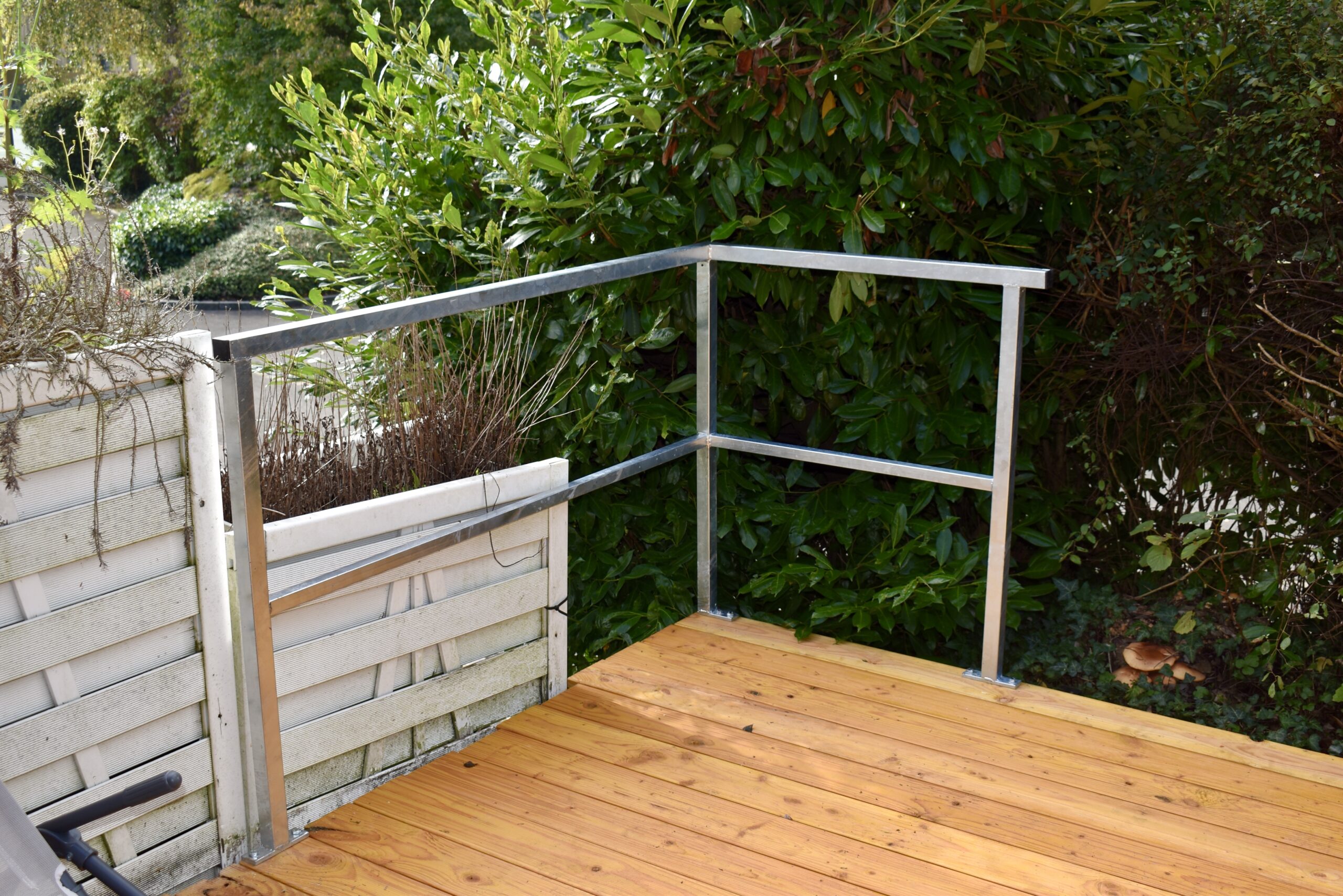 Bei diesem Projekt haben wir die alte und morsche Holzterrasse gegen eine neue ausgetauscht. Ausserdem haben wir auf Wunsch des Kunden in einer Ecke eine Absturzsicherung montiert.