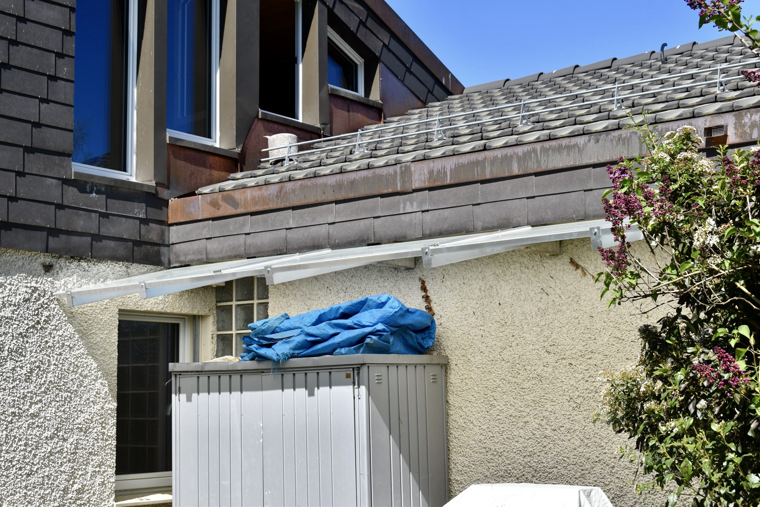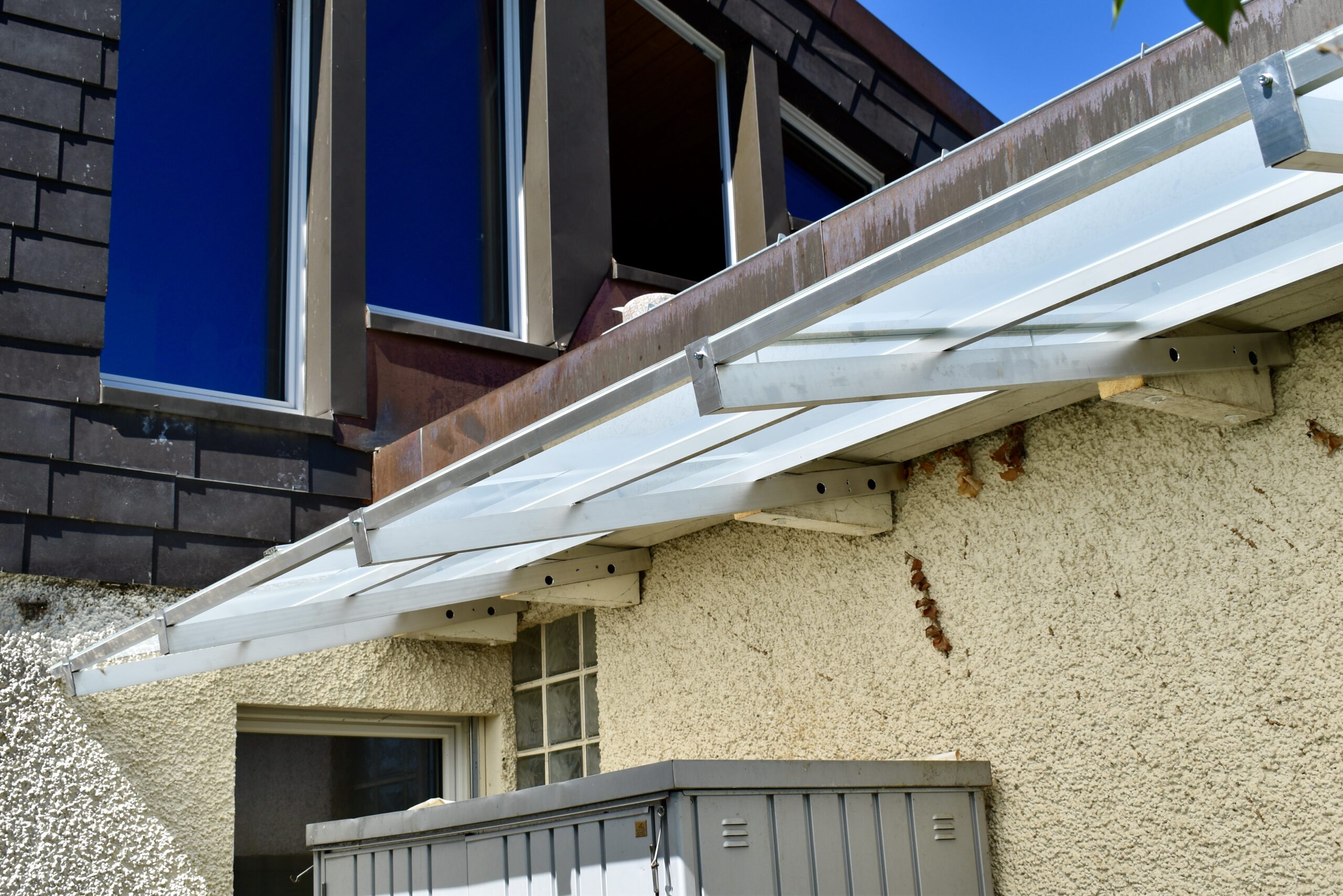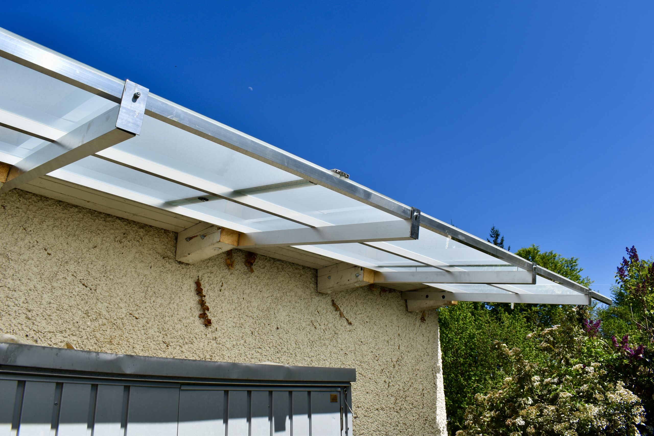 Der Kunde beauftragte uns bei diesem Projekt damit die vorhandene morsche Überdachung zu entfernen und eine neue Überdachung zu montieren. Die neue Überdachung sollte aus Glas sein mit einer Unterkonstruktion aus Aluminiumprofilen. Beim Glas wurde Verbundsicherheitsglas verwendet.